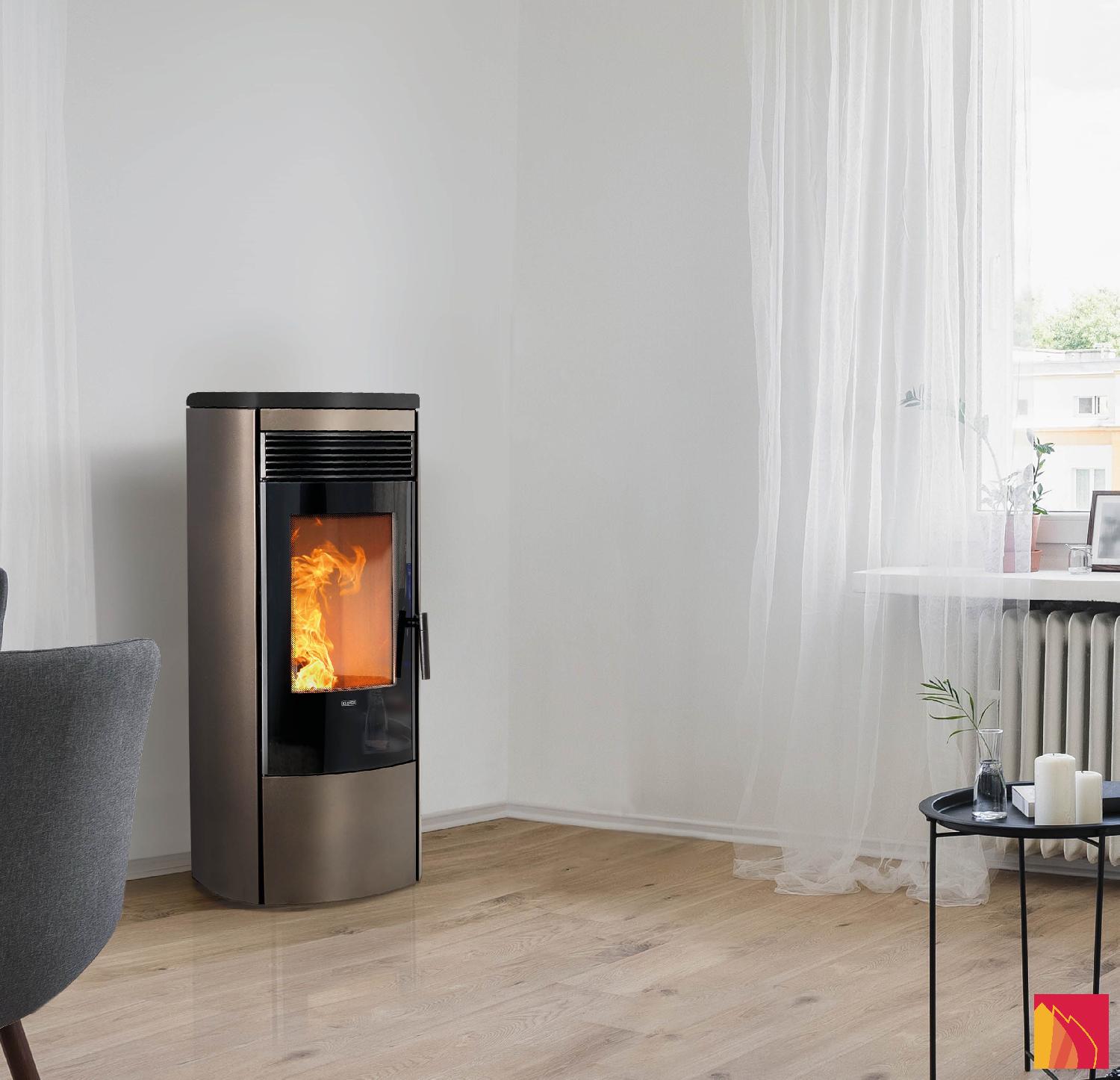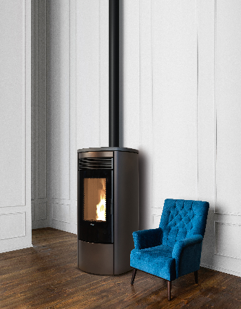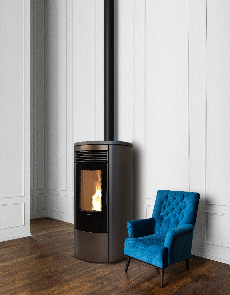 Der Pelletofen Omega Multi Air des italienischen Herstellers Klover ist mit seiner zylindrischen Form, der Tür und der schönen gebogenen Glasscheibe, die den geschwungenen Linien folgt, sowohl ein ästhetischer Erfolg als auch ein qualitativ hochwertiges Heizgerät. Sein schlichtes Design und die vier Farben, aus denen Sie wählen können (Mattschwarz, Bordeaux, Bronze oder Elfenbein), sorgen dafür, dass er in jeder Wohnung seinen Platz findet. Er ist zeitgemäß und platzsparend und verfügt über zahlreiche Sicherheitsfunktionen, die den Alltag seiner Benutzer erleichtern. Mit einem Vorratsbehälter mit einem Fassungsvermögen von 24 kg Pellets.