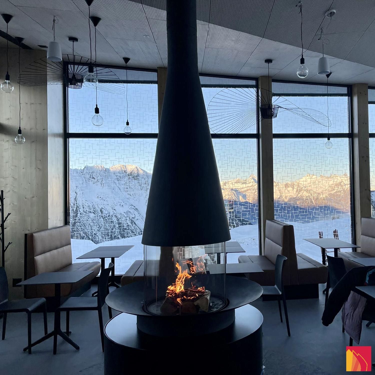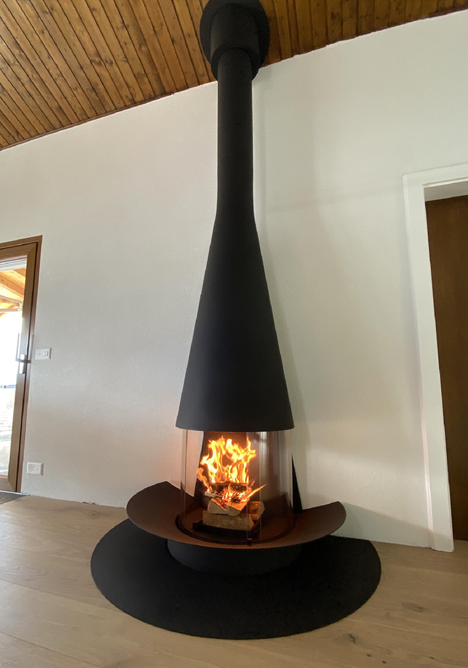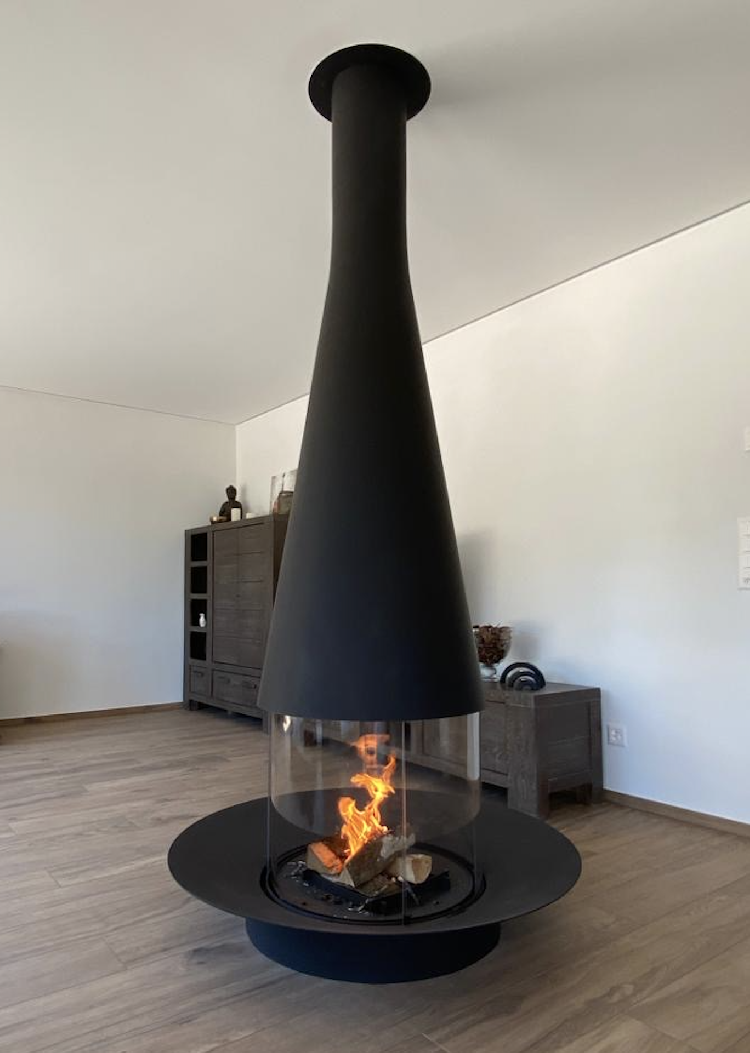 Well beyond its initial role as a heating appliance, the Filiofocus central glass fireplace is an undeniable decorative element. Particularly modular with its many options, this central fireplace, all round, from the Focus Workshops, has a little something ethnic about it. Composed of a conical hood with variable diameter and height in its flexible version, a spark arrester made of four curved pyroceramic glass panes (two fixed transoms and two sliding glass panes) and a fire bed, the Filiofocus central glass fireplace has been awarded numerous distinctions for its original design. Another special feature of this central fireplace under a conical hood is that its hearth bowl can be placed on the floor, included directly in the floor or raised thanks to a matching metal base. A real rallying point for the whole family or friends, it is of an unparalleled conviviality.
