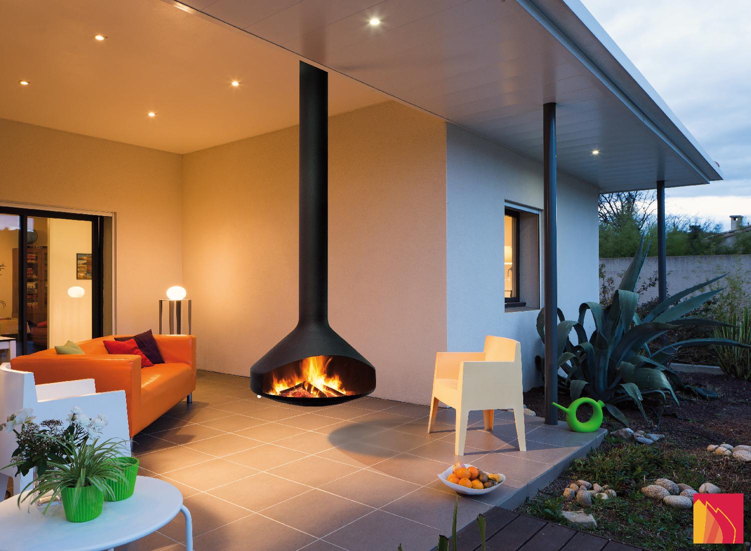 CHEMINÉE POUR L'EXTÉRIEUR, AU FOYER SUSPENDU ET PIVOTANT