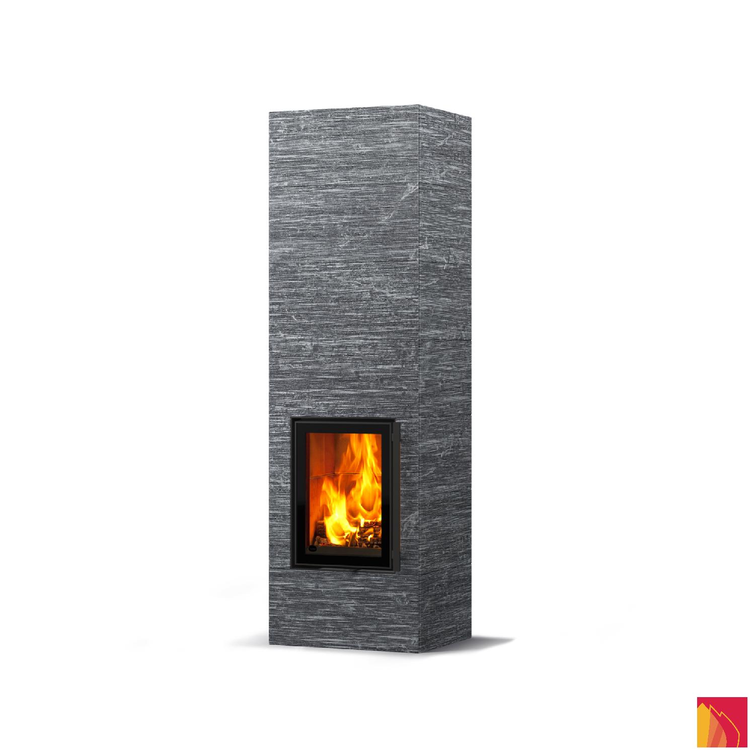 Le revêtement de surface comprend des dalles en stéatite lisses, rainurées ou Grafia avec motifs découpés au jet d’eau. La porte d’aspect moderne dispose d’un fin rebord métallique anthracite et d’un double vitrage.