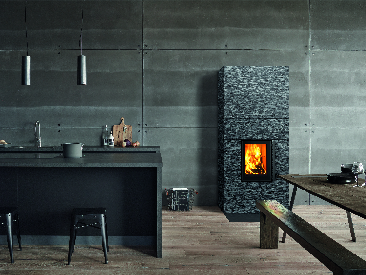 Koli est un poêle minimaliste, dont le trait caractéristique réside dans sa porte rectangulaire orientée verticalement. Les dalles sont agencées en s’alignant sur la porte, ce qui rend l’ensemble encore plus apaisant.