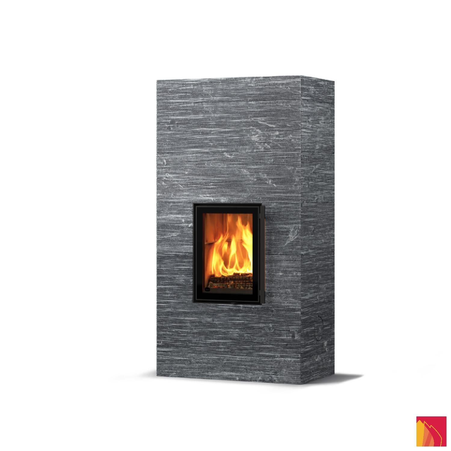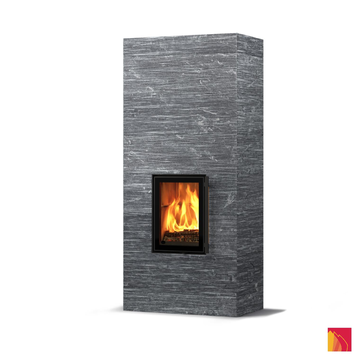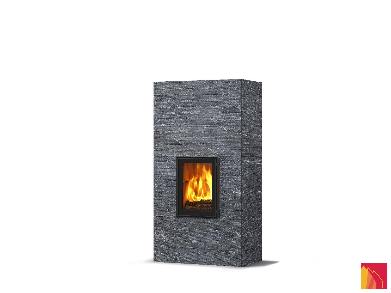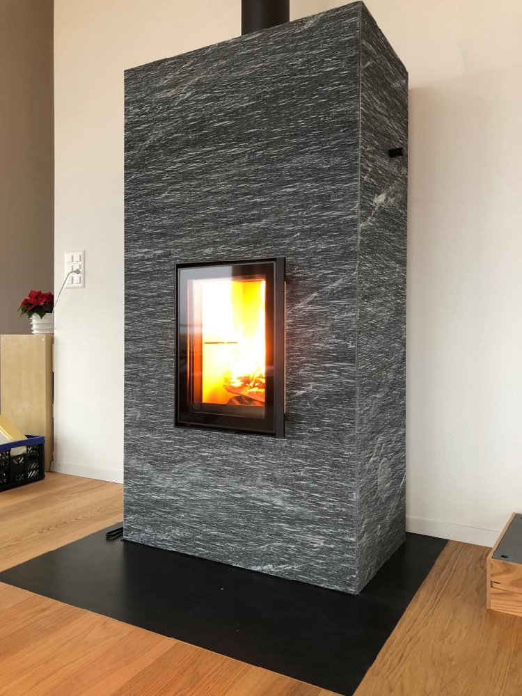 Le revêtement de surface comprend des dalles en stéatite lisses, rainurées ou Grafia avec motifs découpés au jet d’eau. La porte d’aspect moderne dispose d’un fin rebord métallique anthracite et d’un double vitrage.