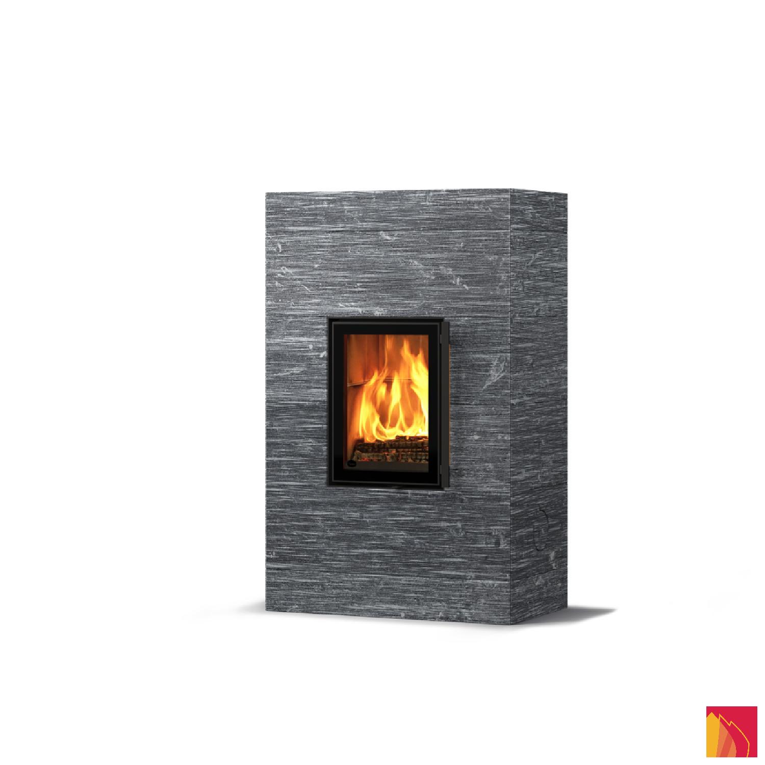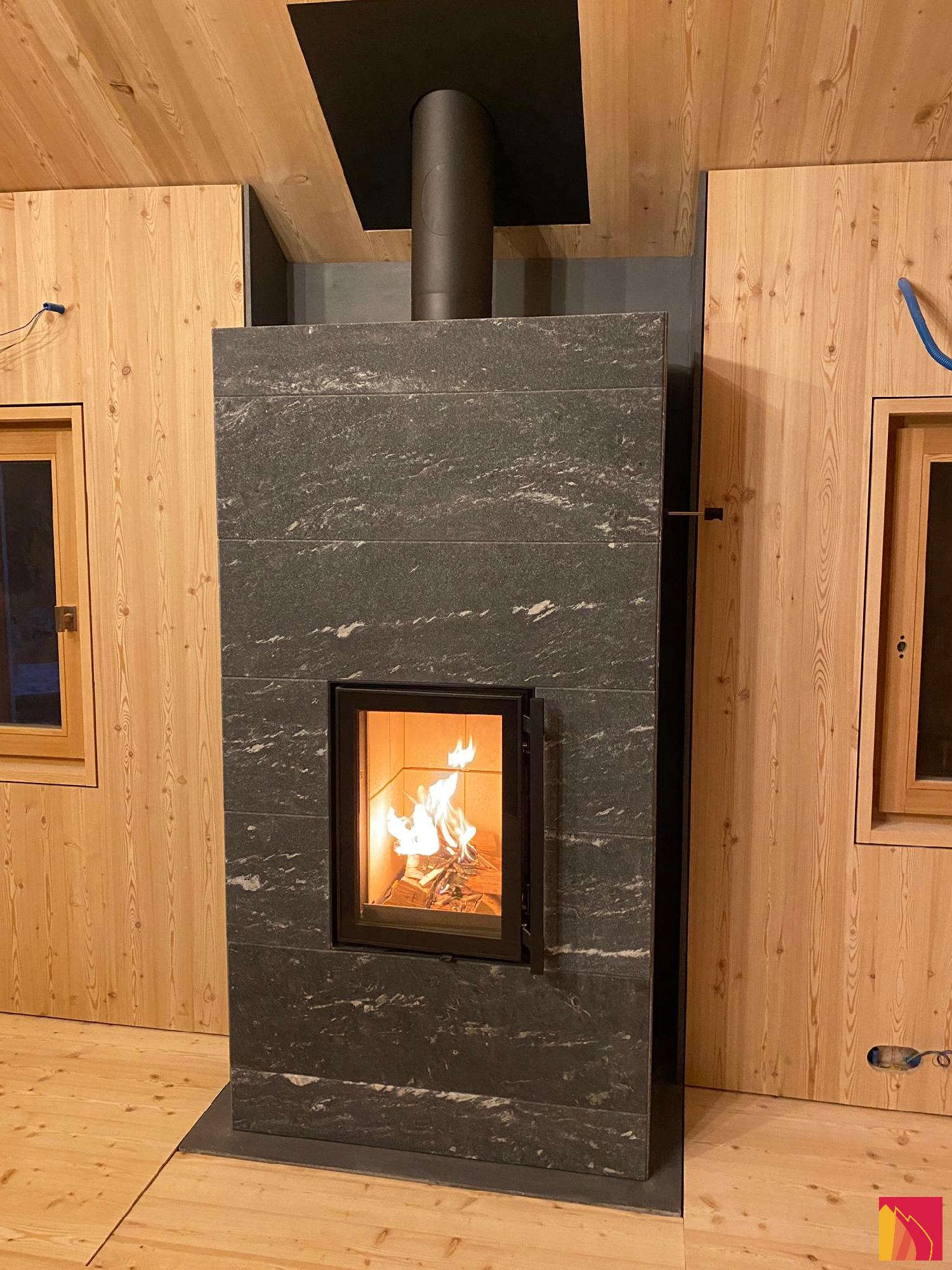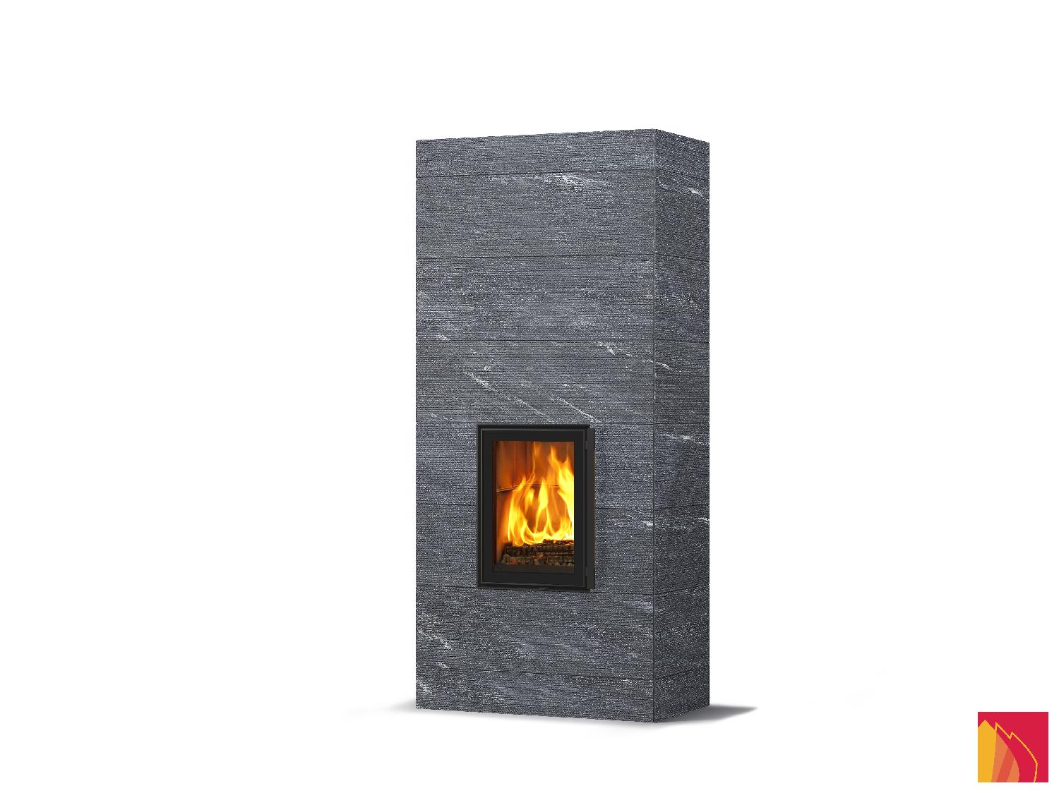 Le revêtement de surface comprend des dalles en stéatite lisses, rainurées ou Grafia avec motifs découpés au jet d’eau. La porte d’aspect moderne dispose d’un fin rebord métallique anthracite et d’un double vitrage.