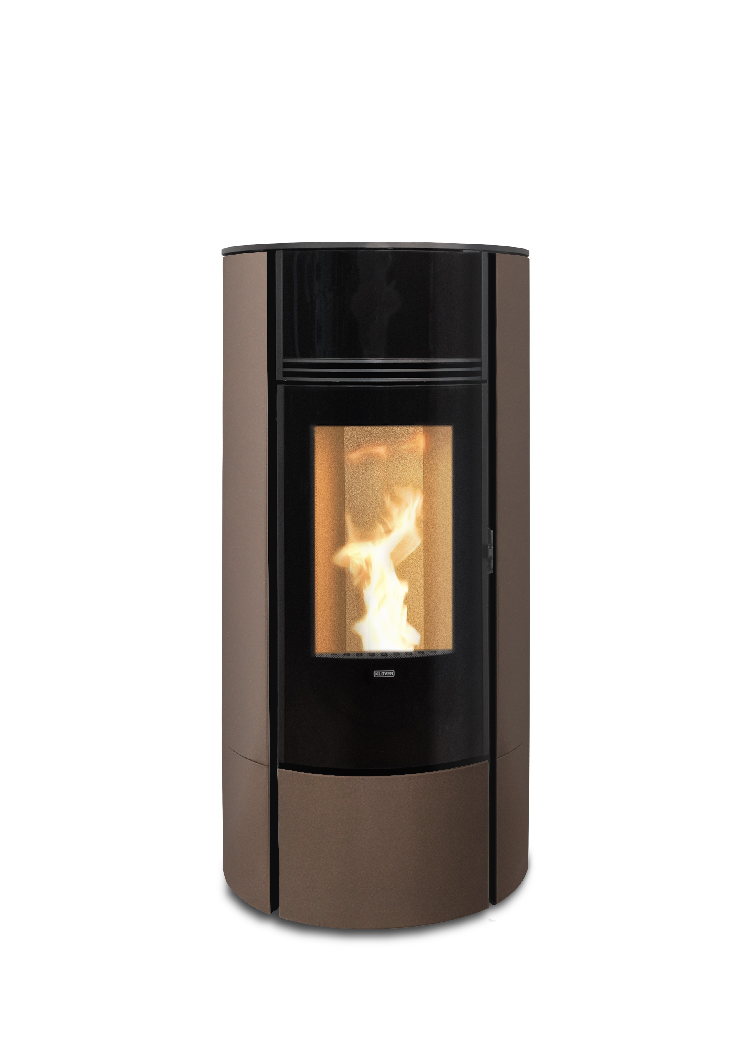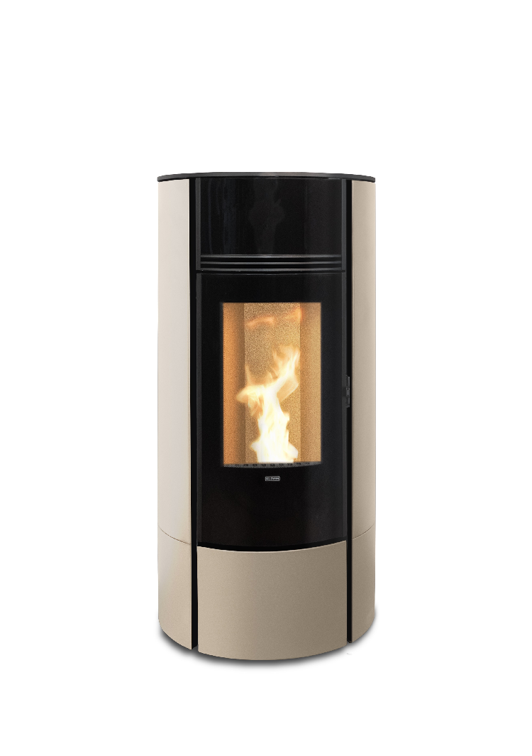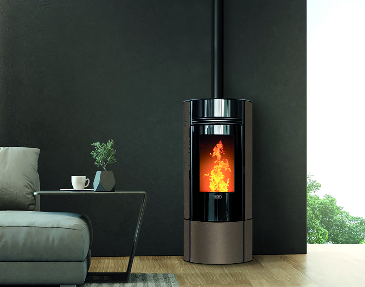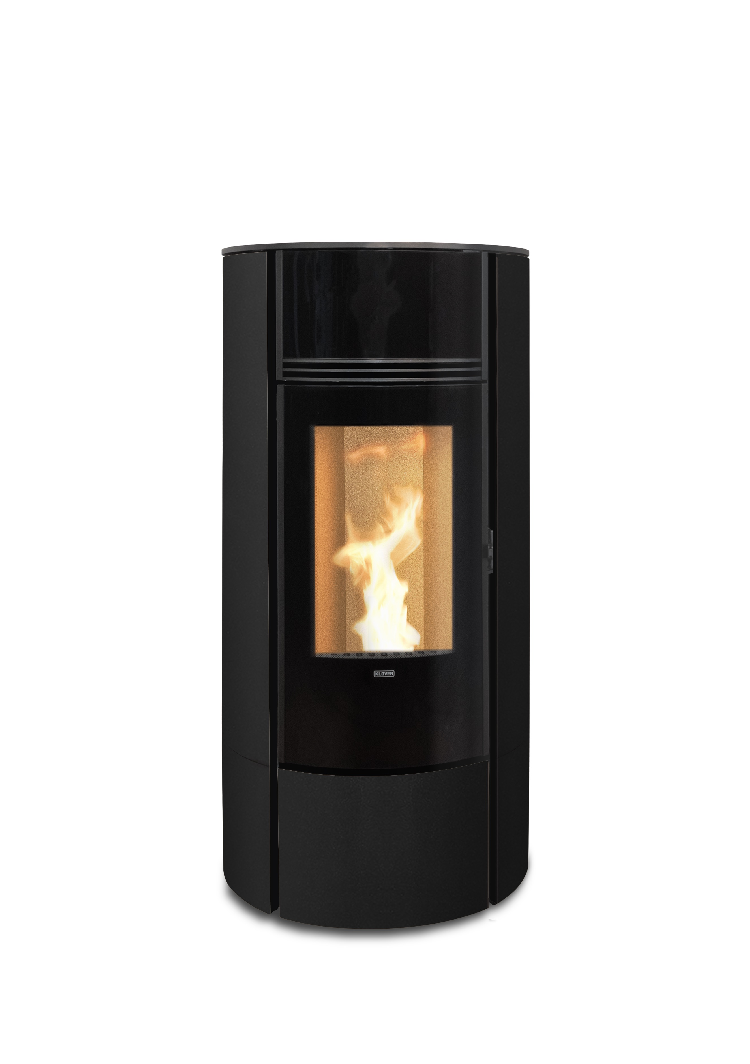 O fogão Klover Super 7 tem uma forma resolutamente moderna, com uma frente pintada de preto e um fundo de cor mais suave. A sua porta perfeitamente curva abre-se bem na chama para um aspecto muito quente e uma óptima visão do fogo. Com seu exaustor de fumaça no topo, o Super pode ser ligado e desligado remotamente através da aplicação WiFi, mas também pode ser regulado diretamente através de seu controle remoto, que também atua como um termostato.